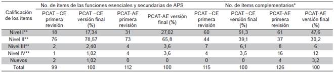 Posterior al análisis de los resultados obtenidos en las pruebas preliminares fue necesario revisar nuevamente los niveles de calificación de los mismos, particularmente, aquellos que requirieron cambios. Como producto de este proceso en el PCAT-CE se eliminó un ítem que había sido propuesto como nuevo por el grupo de expertos en los ítems de las funciones de la APS y un ítem se cambio de nivel de calificación; en cuanto a los ítems complementarios se cambió un ítem del nivel de calificación I al II (Tabla 2).