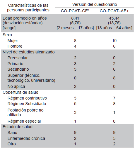 Tabla 3: Características de las personas participantes en las pruebas preliminares de la versión colombiana del CO-PCAT-CE y CO-PCAT-AE