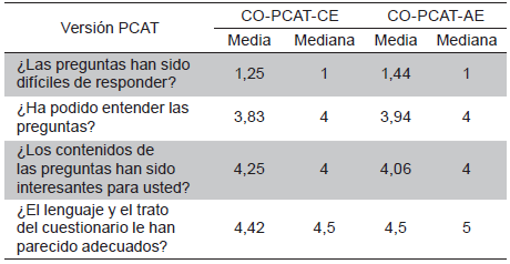 En cuanto a la viabilidad del cuestionario, el diligencia-miento del CO-PCAT-AE requirió 41 minutos en promedio y el CO-PCAT-CE, 37 minutos en promedio. En el cuestionario PCAT-AE el grado de dificultad para responder las preguntas fue bajo (media=1,44), el grado de comprensión fue moderado (media=3,94) y el contenido de las preguntas fue muy interesante (media=4,06). El lenguaje y el trato adecuado del cuestionario obtuvo un nivel elevado (media=4,5). Para el cuestionario CO-PCAT-CE se destacó que el grado de dificultad para responder las preguntas fue bajo (media=1,25), el grado de comprensión fue moderado (media=3,83) y el contenido de las preguntas fue muy interesante (media=4,25). El lenguaje y el trato adecuado del cuestionario, fue elevado (media=4,42) (Tabla 4).