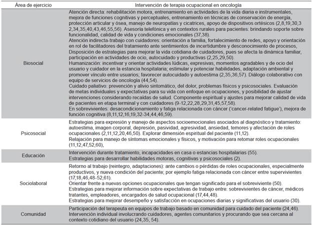 Cuadro 2: Resultados de la revisión sistemática de literatura sobre intervención de terapia ocupacional en oncología, según áreas de ejercicio