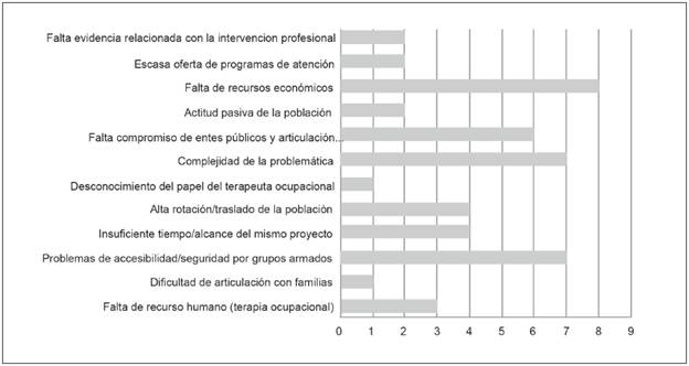 Al indagar sobre la principal dificultad enfrentada durante la experiencia, las respuestas de los terapeutas ocupacionales se pudieron agrupar en doce categorías, entre las cuales destacan por su frecuencia: la falta de recursos económicos; los problemas de accesibilidad geográfica y seguridad por la presencia de actores armados ilegales; y la complejidad de la problemática que resultaba desbordante. Estos hallazgos se muestran en la Figura 2 con las respectivas frecuencias.