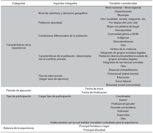 Método descriptivo transversal. Se diseñó la encuesta sobre experiencias profesionales en el conflicto armado colombiano, versión digital, en el aplicativo Typeform, el cual también arrojó las respuestas y su distribución porcentual. El instrumento se estructuró en cuatro categorías y doce preguntas, principalmente de selección múltiple, según muestra el Cuadro 1. Además le permitía a los encuestados adjuntar fotografías o soporte visual de la experiencia reportada.