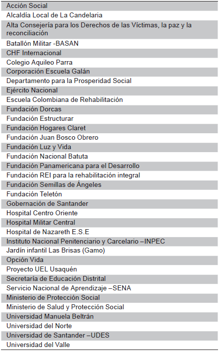 El inventario de instituciones con las cuales estuvieron vinculados los terapeutas ocupacionales en las experiencias, según reporte de ellos mismos, se muestra en el Cuadro 2. Dos profesionales seleccionaron la opción No aplica, y otra más solamente mencionó que era una organización no gubernamental -ONG, sin especificar el nombre; por tanto estas respuestas no se consideran en el cuadro. Las instituciones más frecuentemente mencionadas por la muestra fueron Ejército Nacional, Escuela Colombiana de Rehabilitación, Fundación Nacional Batuta, Hospital de Nazareth y Universidad Manuela Beltrán. El 47,2 % de las instituciones referenciadas por la muestra corresponden a organismos del sector público.