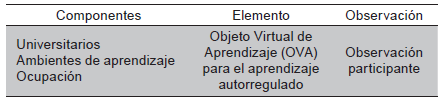 Ocupación. Para este estudio la ocupación se relaciona con los componentes y aspectos que se espera desarrolle un estudiante universitario (Cuadro 2), y se obtuvieron de los datos de los estudiantes. La muestra indicó que el ova le permitió profundizar sobre el tema que desarrollaron. La mitad manifestó que puso en práctica conocimientos previos sobre el uso de tecnologías indicando que "no eran muy amplios". La otra mitad reveló que no puso en práctica conocimientos anteriores, con referencia a estrategias interactivas.