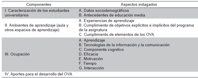 Cuadro 2: Componentes del Cuestionario Objetos Virtuales para el aprendizaje en el campo educativo