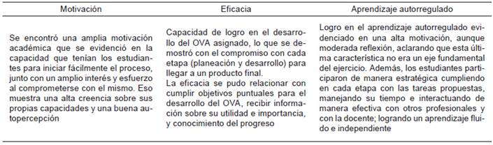 Los estudiantes manifestaron que no fueron conscientes del uso de elementos cognitivos para el desarrollo del ova durante el ejercicio. La mitad indica que fue consciente en un momento posterior y la otra mitad que no hubo tiempo para la reflexión sobre este aspecto. Los estudiantes conocieron su eficacia para asumir tareas académicas vinculadas con la tecnología e indicaron que el ova es un medio tecnológico que favorece su motivación para el aprendizaje.