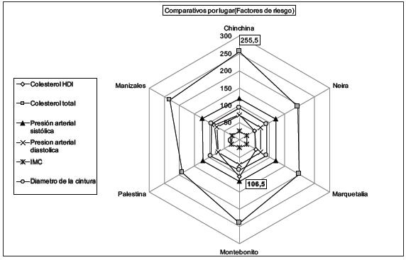 La población de Chinchiná presentó dos factores de riesgo cardiovascular adicionales aparte de la hipercolesterolemia: El IMC y la circunferencia de la cintura, que deben ser intervenidos. Los municipios de Neira y Marquetalia presentaron cifras, como se observa en la Tabla 2, con medias normales en los factores de riesgo, en contraste con la población de Palestina que presentó un IMC por encima de 26 kg/m2; indicando que el promedio de la población que participó en este municipio se encuentra en sobrepeso. Según datos de la OMS, esta es una información importante debido a que esta población también presentó promedios de circunferencia de la cintura altos, 94 cm. De acuerdo con la IDF (Federación internacional de diabetes), los hombres presentan riesgo con cifras por encima de 90 cm y las mujeres de 80 cm. (Tabla 2).
