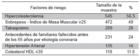 La Tabla 1 permite evidenciar que la hipercolesterolemia fue el factor de riesgo más prevalente en el estudio; 56.5 % de la población presento cifras mayores o iguales a 200 mg/dl, coincidiendo con un 49 % de la población que presentó sobrepeso.