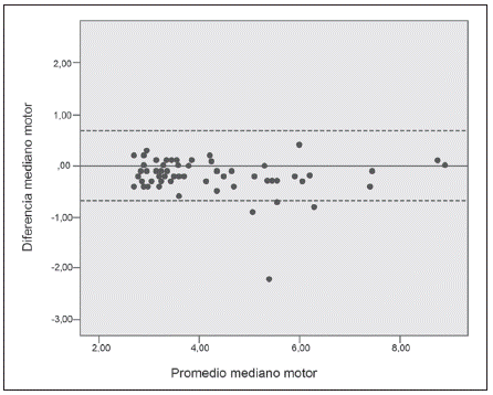 Mediante la transformación logarítmica y con los antilogaritmos de los valores obtenidos se encontraron los siguientes límites de acuerdo (IC 95 %) en milisegundos: para el nervio mediano motor, límite inferior 0,8 y límite superior 1,0; para el nervio mediano sensitivo, límite inferior 0,8 y límite superior 1,0.