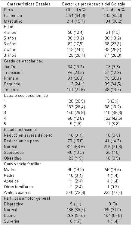 El estado nutricional adecuado fue el más observado, tanto en niños y niñas de colegios oficiales representado en un 66,5 %, como en colegios privado con el 71,8 %. La convivencia familiar con ambos padres se observó en un 77,4 % en los estudiantes del sector privado, solo el 72,6 % del sector oficial cumplen con esta característica; para el perfil psicomotor general; un grupo representado en el 67,6 % del sector educativo privado, evidenció un desempeño bueno, mientras que para el sector oficial se observó en un 57,5 %.