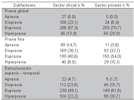 Al medir los subfactores de acuerdo al sector de procedencia de la escuela, se puede observar en la Tabla 2 que el desempeño eupráxico-hiperpráxico en el subfactor praxia global, es el de mayor frecuencia en los niños y niñas en ambos sectores educativos con 91,6 % y 71,2 % para privado y oficial respectivamente. Con relación a praxia fina se pudo observar que el 50,8 % de los estudiantes de las escuelas oficiales obtuvo un mayor predominio un desempeño apráxico-dispráxico; y para el sector privado el mayor porcentaje que corresponde al 64,I % el desempeño fue eupráxico-hiperpráxico; para la estructuración espacio-temporal se reportó un desempeño eupráxico-hi-perpráxico en el 82,6 % de los estudiantes del sector privado y el 7i,3 % de los oficiales.