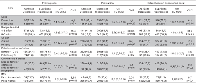 Existe mayor riesgo para un desempeño apráxico-dispráxico del subfactor praxia global para los escolares de cuatro a cinco años [OR 4,8; IC 95 %; 3,3-7,1] que estudian en colegios oficiales [OR 4,4; IC 95 %; 2,7-7,3]; los que viven en estrato 1, 2 y 3 [OR 2,4; IC 95 %; 1,5-3,9] y quienes tienen un peso aumentado [OR 2; IC 95 %; 1,2-3,3]. El mayor riesgo para un desempeño apráxico-dispráxico en praxia fina fue los participantes de cuatro a cinco años de edad [OR 3,7; IC 95 %; 2,7-5,3], para los estudiantes de colegios oficiales [OR 1,9; IC 95 %; 1,3-2,]. Un desempeño apráxico-dispráxico en el subfactor estructuración espacio temporal es mayor en las niñas [OR 1,6; IC 95 %; 1,12,2], para los escolares de cuatro a cinco [OR 4,8; IC 95 %; 3,3-7,1]; en los que estudian en el sector oficial [OR 1,9; IC 95 %; 2,7-5,3]; para los que residen en estratos socioeconómicos 1, 2 y 3 [OR 1,6; IC 95 %; 1,1-2,7].