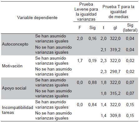 Tal y como se puede observar en la Tabla 1, al aplicar la prueba de Levene de las muestras independientes para la igualdad de varianzas, se asumen varianzas iguales en todas las variables (p>0,05). La prueba t de Student para la igualdad de medias, muestra que existen diferencias significativas en autoconcepto (t=2,0; p= ,04) y en motivación (t=2,3; p=0,02) en función del género. Las diferencias no son significativas en apoyo social (t=1,8; p=0,07) ni en incompatibilidad de tareas (t=1,4; p=0,15) en función del género.