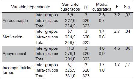 Respecto a las relaciones entre los cursos se ha obtenido que existen diferencias significativas en autoconcepto (F= 3,2; p=,02), en motivación (F=2,7; p=,04) y en apoyo social (F=4,6; p=,00). Sin embargo, no hay diferencias significativas en incompatibilidad de tareas en función del curso (F=I,7; p=,17) (Tabla 2).