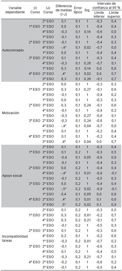 Tal y como se muestra en la Tabla 3, se puede apreciar que existe relación significativa en auto concepto en 2° de la ESO con 4° de la ESO (p=0,02), en motivación 3° de la ESO con 4° de la ESO (p=0,04) y en apoyo social entre 2° de la ESO y 4° de la ESO (p=0,01); y también entre 3° de la ESO y 4° de la ESO (p=0,02), 4° de la ESO con 2° de la ESO (p=0,01) y en 4° de la ESO con 3° de la ESO (p=0,02). No hay relación significativa con incompatibilidad de tareas (Tabla 3).
