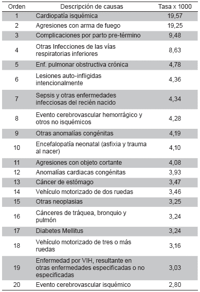 Tabla 5: Primeras veinte causas por Años Perdidos por Muerte Prematura APMP (tasa x 1.000). Colombia ámbito nacional y ambos sexos, 2012