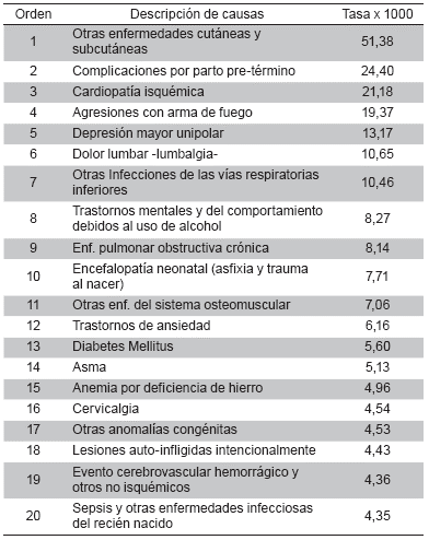 Tabla 7: Primeras veinte causas por Años de Vida Ajustados por Discapacidad AVISAs Totales (tasa x 1.000). Colombia ámbitonacional y ambos sexos, 2012