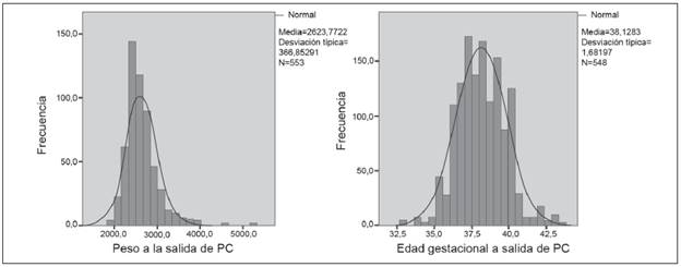 La salida de la posición canguro, cuando estos bebes son capaces de termo regular, es hacia los 2 624g y 38 semanas, similar a la evidencia disponible. En los oxígeno dependientes el destete del oxígeno se realiza hacia los 3800g, igual que en otras poblaciones, a pesar de tener puntos extremos por comorbilidades de ciertos pacientes, situación que indica cómo el destete depende más de la recuperación nutricional evidenciada por el peso, que de la edad gestacional corregida.