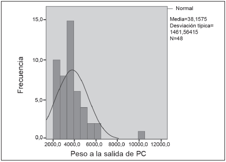 El promedio de peso al que salen los pacientes de la posición canguro fue de 2 624g con desviación típica de 367 g y el promedio de edad gestacional 38 semanas con desviación típica de 1,7 semanas (Figuras 1 y 2). La media de peso al destete de oxígeno fue de 3816g con desviación típica de 1 462 g (Figura 3).