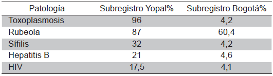 En cuanto a las principales patologías, el 31% de las madres eran pre-eclámpticas o con gestación múltiple y un 25% tenía antecedente de IVU, factores de riesgo para parto prematuro similares a los encontrados en Bogotá. A pesar de ser pacientes de alto riesgo, llama la atención que aún encontremos ausencia de control prenatal o inicio tardío. En Bogotá, el 82% inicia controles en el primer trimestre vs el 69% en Yopal. Adicionalmente, 49% de las pacientes con menos de 34 semanas no recibió corticoterapia previa y existe un sub-registro importante en los laboratorios perinatales para las entidades tipo STORCH (Tabla 2). No se encontró registro para T. Gondii en 96% de las pacientes vs 4,2% en Bogotá; en 21% no hubo registro de estudios para Hepatitis B vs 4,6%, en 87% vs 60,4% para rubeola, en 32%vs 4,2% para sífilis y 17,5% vs 4,1% no tenía datos de exámenes para HIV. Un 1,3% vs 0,4% tenía serología positiva para sífilis.