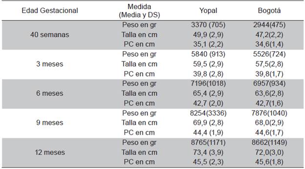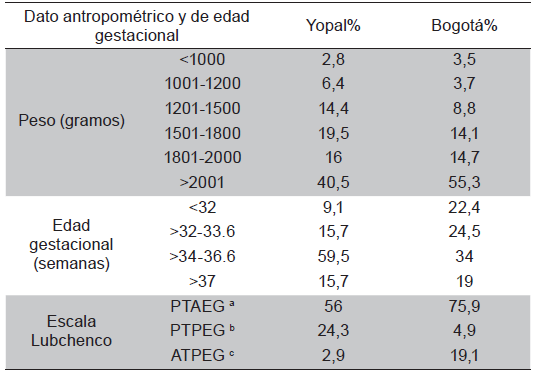 Según las medidas antropométricas disponibles, se encontraron más pacientes con RCIU en Yopal. El 44% de los bebés canguro de Yopal vs 35% de los bebés canguro de Bogotá eran de bajo peso para la edad gestacional según la escala de Lubchenco (prematuro y a término).