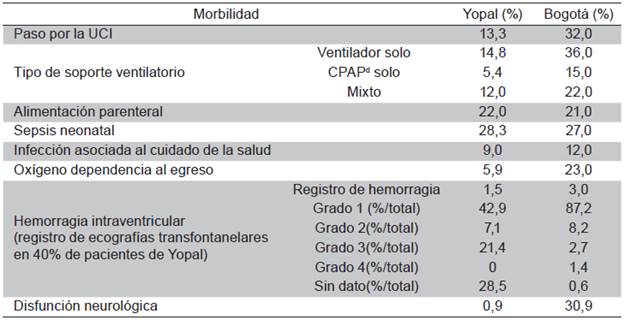 La Tabla 4 muestra las morbilidades. Un 13% de los pacientes requirió manejo en la unidad de cuidados intensivos (UCI). Encontramos una incidencia de 28% de sepsis neonatal en general y 9% de infecciones asociadas al cuidado de la salud. En Bogotá las cifras son similares, de 35% y 12%, respectivamente. Un 22% de los pacientes de Yopal tuvo acceso a nutrición parenteral vs un 21% en Bogotá y a un 32% se le ofreció la posibilidad de ventilación invasiva y/o no invasiva vs 59,8% para Bogotá. Aproximadamente en un 60% de los pacientes canguro de Yopal no hay registro de ecografía transfontanelar. En Bogotá, el 99% tiene ecografía transfontanelar informada; 0,9% tenía disfunción neurológica al ingresar al programa canguro.