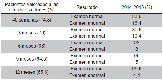 A las 40 semanas 16,4% de los valorados tenía un examen neuromotor anormal. A los 12 meses, el porcentaje disminuyó a 4,4% (Tabla 7). El coeficiente de desarrollo a seis meses medido por la Prueba de Griffiths se practicó en 56% de todos los pacientes de los cuales 3,4% no fue normal (<90). A los 12 meses se practicó en 58,2% de los cuales 10,4% tuvo resultado no normal (<90). 4,4% tuvo un examen neuromotor no normal a 12 meses y 2,9% de ellos fue clasificado como de riesgo alto de parálisis cerebral en el futuro.