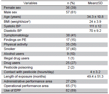 Table 1 shows that most workers were males who worked in the operational area in positions such as technical applicator (32 %) and production assistants (15 %). The population was mainly young, with secondary education, exposed to pesticides from 1 to 10 years, and daily exposure between 1 to 5 hours. 82 % reported the use of personal protection equipment (PPE) since they had direct exposure to OPCP. Only 2 % of the workers reported a history of pesticide poisoning; one of them required hospitalization with no sequelae at the time of the interview.
