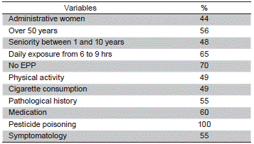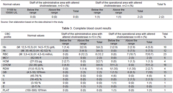 The results of this study are consistent with those reported in the international literature, which shows evidence of a decrease in the red cell count and an increase in the white cell count, supporting the assertion that these pesticides, by means of lipid peroxidation, alter the red cell count and activate a defense mechanism of the immune system with an increase in the number of white cells. The alterations in erythrocyte cholinesterase did not have significant relevance in this study; however, the indicated procedure is to compare cholinesterase before exposure or periodic cholinesterases after exposure, given the mentioned variations.