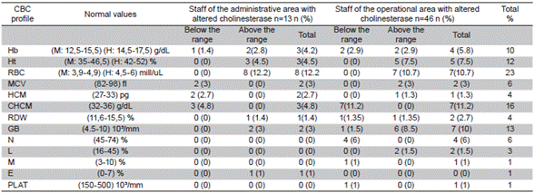 The highest proportion of alterations in the CBC was found in administrative women, with RBC above the range (44 %). In this group, WBC above the range (13 %), MCV below the range (13 %) and MCHC below the range were also observed, which is related to hematotoxicity produced by the pesticides of interest and could be attributed to the lack of use of EPP by most administrative workers, considering that they share the same work area where chemical products are stored or processed.