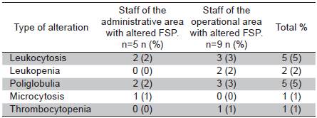 The FSP showed some type of abnormality in the count or morphology of the cell lines by 15 %. The alterations corresponded to mild leukopenia, leukocytosis, erythrocytosis, microcytic - normochromic RBC (+) and thrombocytopenia (Table 5). 85 % of the participants had a normal FSP.