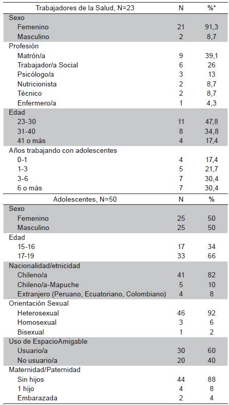 Los informantes clave y trabajadores de salud fueron contactados directamente en los Espacios Amigables abordados por el estudio. Los adolescentes fueron contactados inicialmente través de los equipos de salud y profesores, y por el equipo de investigación en organizaciones juveniles de la sociedad civil y salas de espera de los Servicios de Atención Primaria de Salud. Posteriormente, a través del muestreo de bola de nieve, por el cual los primeros participantes reclutaron a otros entre sus conocidos. Los adolescentes incluidos tenían entre 15 y 19 años, sin criterios de exclusión. La muestra se intencionó con el fin de incluir a mujeres embarazadas y hombres con parejas en gestación, o que ya hubiesen sido madres/padres así como también adolescentes sin hijos; adolescentes de diversos orígenes étnicos; que se identificaran con diferentes orientaciones sexuales; y que fueran usuarios y no usuarios de los Espacios Amigables. De todos los contactos, cinco adolescentes no participaron por falta de consentimiento de sus padres (Tabla 1).