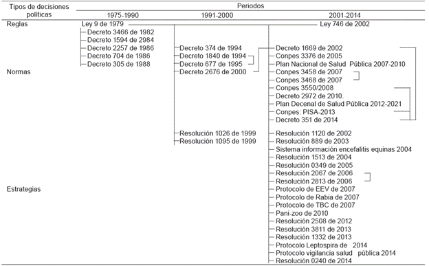 Las relaciones entre las políticas se dan por los contenidos generales, parciales o específicos en zoonosis, los cuales con frecuencia involucran también enfermedades transmisibles y la salud ambiental. El esquema de relaciones indica que, desde un punto de vista general, las políticas de zoonosis en Colombia conforman un entramado de largo plazo y abundante en decisiones de diferente tipo (Figura 1 y 2).