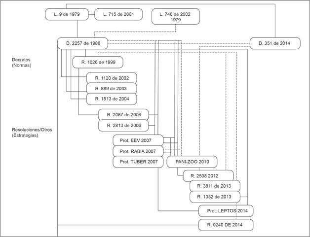 Los ejes normativos centrales en cuanto a jerarquía, contenido, relación directa con las zoonosis en Colombia y persistencia en el tiempo, son el Código Sanitario Nacional (Ley 9 de 1979) y el Decreto 2 257 de 1986, que definieron los marcos para la investigación, prevención y control. Partiendo de estos dos ejes se presentan los tipos de relaciones que se encontraron (Figura 2).