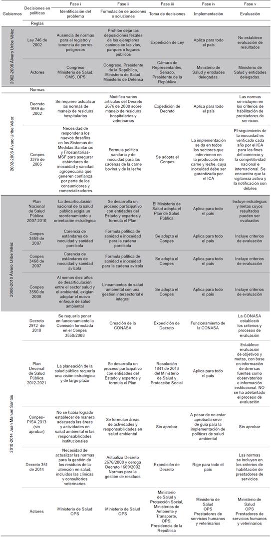 En este periodo la gran mayoría de políticas de zoonosis llegaron hasta el proceso de identificación del problema y la formulación de soluciones; algunas pasaron por el proceso de toma de decisiones y muy pocas evidencian la fase de implementación y evaluación 12-16. A continuación, se presenta el resumen del proceso (Tabla 1).