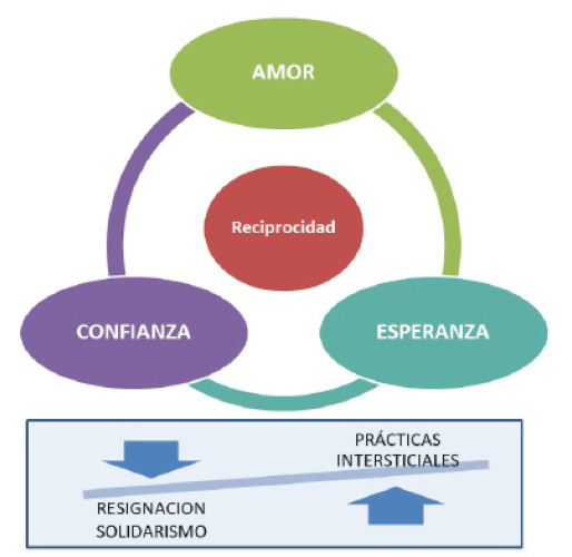 La esperanza, aunque tensionada con el miedo, motoriza la acción, en la medida en que implica el deseo y la expectativa de que una posibilidad deseada se haga real (Ahmed 2019). La confianza implica “creer en la otra mujer” y enlazar el vínculo de dar-recibir-dar desde el que se rompe con la religión neocolonial, porque la credibilidad destituye a la frustración como mecanismo de coordinación social. En este contexto, desplazarse en la organización cotidiana de la vida con prácticas de reciprocidad al interior de la comunidad barrial diluye al solidarismo. Finalmente, el amor teje las interacciones de la reciprocidad por cuanto amar al otro es alimentarse con él (Le Breton 2007); amar es desear la autonomía del otro (Scribano 2020) y, para ello, se potencia la acción, comprendiendo los infortunios, para disputar, en los límites de las posibilidades, la distribución de las energías.