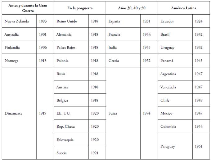 Tabla 1: El reconocimiento del derecho al voto femenino