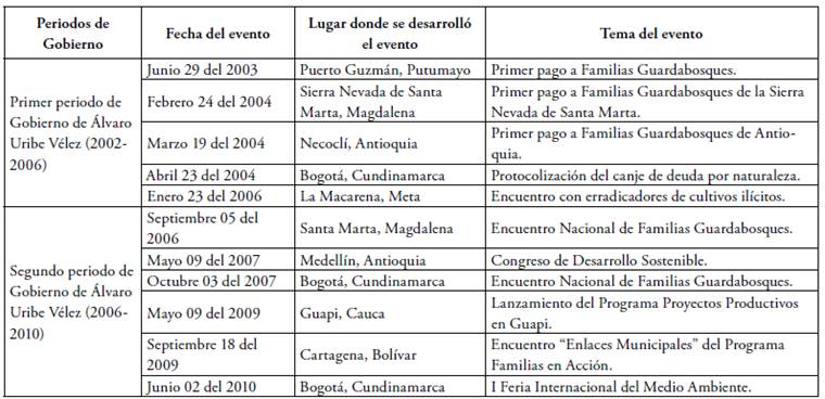 Alvaro Uribe Vélez participó durante sus ocho años de gobierno en, al menos, 34 eventos públicos donde tuvo ocasión de enunciar su discurso político a propósito de la implementación del PFGB. Se tiene certeza que 23 de estos eventos fueron transmitidos por los canales institucionales de televisión con cobertura nacional, y, a juzgar por la territorialidad de los escenarios donde se desarrollaron estas declaraciones públicas, se puede afirmar que su discurso halló audiencia en todos los departamentos del país. Si correlacionamos estos datos en términos de frecuencia, advertimos que durante los 96 meses que duraron sus dos periodos de gobierno, un promedio de un (1) discurso público fue enunciado cada 2,8 meses con alguna referencia explícita sobre el PFGB.