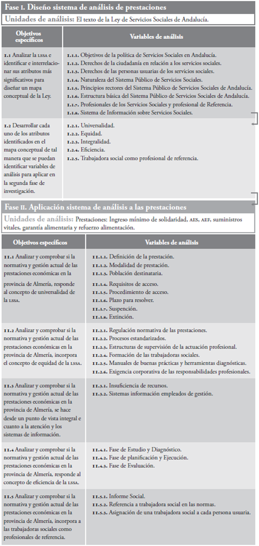 En consonancia, se propone como objetivo diseñar y aplicar un sistema de análisis que permita comprobar si las prestaciones económicas periódicas, que dan cobertura a las necesidades de alimentación y alojamiento gestionadas en la provincia de Almería, responden a los criterios de la Ley de Servicios Sociales de Almería -en adelante, LSSA-. Se hace una selección de qué aspectos de la Ley han de ser tenidos en consideración y cómo pueden ser contrapuestos a la arquitectura actual de atención.