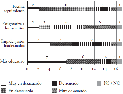 Por otro lado, la valoración de las trabajadoras sociales con respecto a las implicaciones del pago en especie también lleva a considerar que, en general, la perciben como una forma inadecuada de aprovisionamiento, como se puede comprobar gráficamente en la figura 4. Así, el 72 % no confía en que sea una práctica educativa, el 39 % incluso expresa el mayor grado de desacuerdo. Curiosamente, en una proporción similar, el 77 % valora la bondad de la medida para evitar gastos innecesarios, aunque mayoritariamente las trabajadoras sociales confían en que facilita el seguimiento. Con respecto a si estigmatiza a los usuarios que reciben la ayuda de esta manera, el 72 % comparte esta afirmación en mayor o menor intensidad.