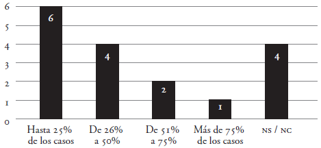 Insuficiencia de recursos: sobre la valoración del presupuesto disponible para prestaciones económicas, las trabajadoras sociales asignan un 7 sobre 10 a esta categoría. Sin embargo, se ven obligadas a derivar a otras agencias, como Cáritas, Cruz Roja o Bancos de Alimentos, con relativa asiduidad. En la figura 5 se muestra el porcentaje con el que se recurre a esta práctica:
