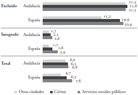 Asimismo, el informe Foessa (2014) constata que los hogares, cuando precisan ayuda, acuden a los servicios públicos prácticamente en la misma medida que lo hacen a Cáritas10 u otras entidades; pero en Andalucía acuden más a Cáritas cuando se encuentran en una situación de exclusión, como se evidencia en la figura 7.