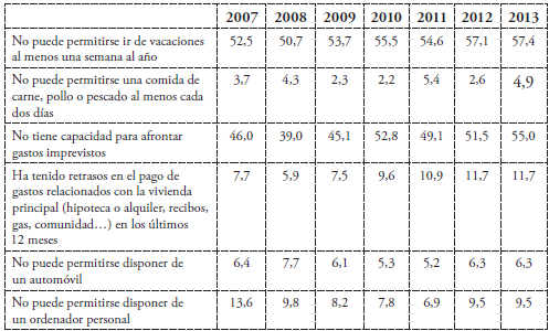 Tabla 2: Hogares en Andalucía con carencia material según conceptos entre 2007 y 2013