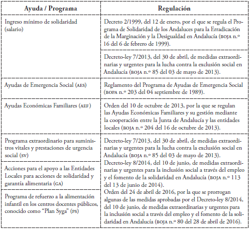 Ligadas a situaciones de exclusión o en riesgo de ello, por lo que no se van a analizar las ayudas destinadas a la generalidad de la población sin necesidad de acreditación de una situación de vulnerabilidad, como pudiera ser el caso de las ayudas contempladas en el Decreto 137/2002 del 30 de abril, de apoyo a las familias andaluzas. No suponen una intervención profesional y, por tanto, carecen del suficiente interés para el análisis.