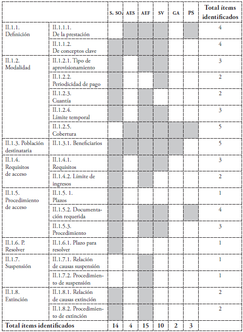 Por otro lado, en un primer análisis de los atributos que determinaban la universalidad, se puede identificar que las categorías que suelen cumplirse en mayor número de prestaciones son las referidas a la determinación de sus beneficiarios y la incorporación de definiciones que ayudan a la interpretación de la norma. En el extremo opuesto, apenas se regulan los aspectos referidos a las cuestiones más garantistas para la ciudadanía en la tramitación técnico-administrativa (plazo para resolver, procedimientos y causas de suspensión).
