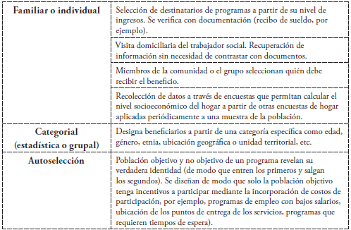 Es posible identificar tres modalidades de focalización según la forma de selección del grupo objetivo durante la implementación de políticas sociales en la década de 1990 (tabla 1).
