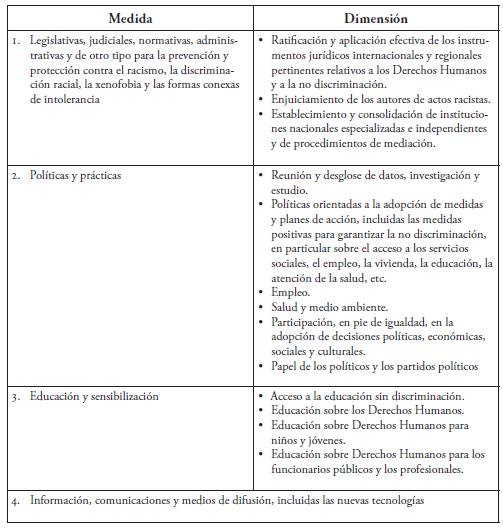 En el ámbito de la Conferencia de Durban se expide un plan de acciones que contempla a los pueblos afrodescendientes, entre otros grupos discriminados, y propone a los Estados intervenir con "[...] medidas de prevención, educación y protección destinadas a erradicar el racismo, la discriminación racial, la xenofobia y las formas conexas de intolerancia en los ámbitos nacional, regional e internacional" (Oficina del Alto Comisionado de las Naciones Unidas para los Derechos Humanos 2002, 26). El Plan de Acción de Durban propone un conjunto estructurado de medidas para que diferentes organismos, tales como los Estados parte y las Naciones Unidas, las implementen de acuerdo con su ámbito de incidencia local, nacional, regional y mundial. Para el caso de las y los afrodescendientes, las medidas indicadas al Estado, en el ámbito nacional, se presentan en la tabla 1.