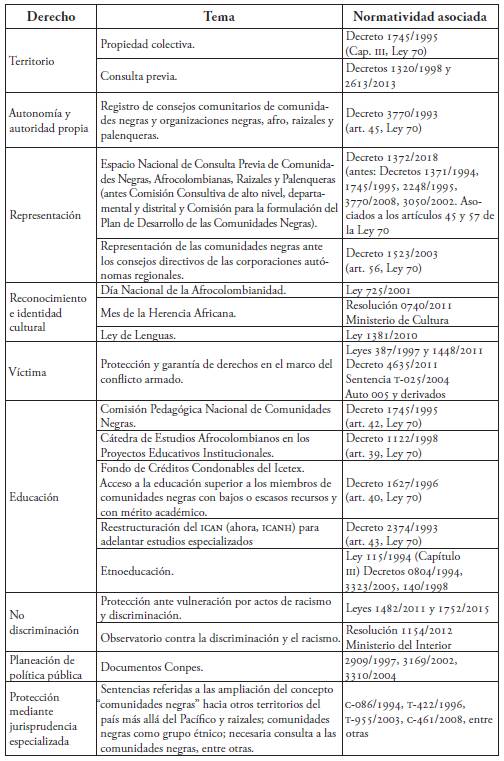 Con la Ley 70 de 1993, como referente, y los compromisos supranacionales antes referidos, Colombia acumula un conjunto de recursos normativos señalados en la tabla 2.