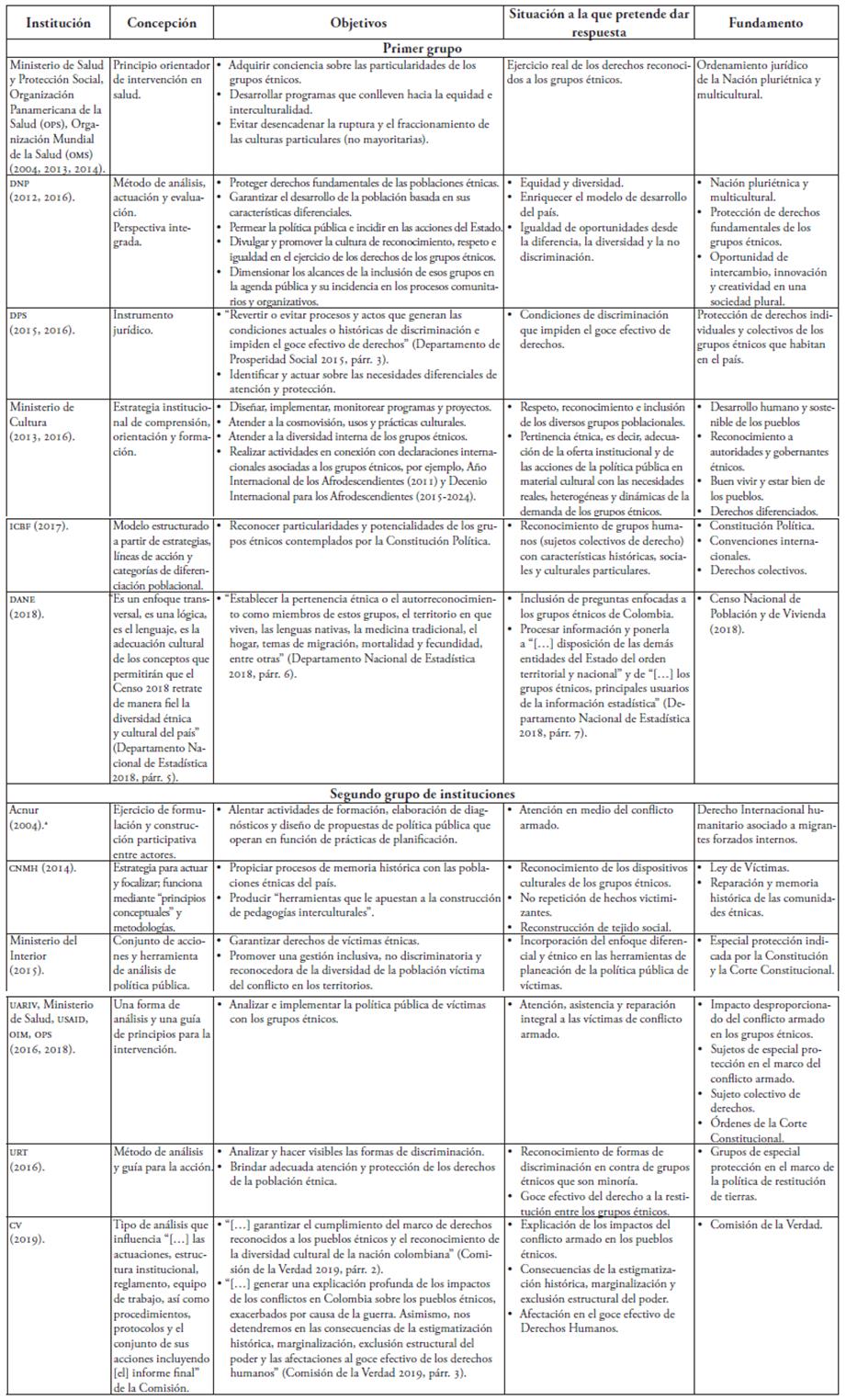 Al respecto del enfoque diferencial en clave étnica, algunas instituciones del Estado proponen concepciones adaptadas a sus intereses misionales; otras adhieren, usan y reproducen la noción de enfoque diferencial étnico -en adelante, EDE- de otras instituciones sin ninguna mediación o adaptación respecto de su función social. La tabla 3 sintetiza los objetivos, fundamentos y puntos de partida o situaciones a las que pretenden dar respuesta las instituciones que conciben el EDE. Al inicio, presento las formulaciones de algunas instituciones del Estado, del nivel nacional, que asumen el EDE como componente de sus intervenciones públicas de acuerdo con su misión y función social: Ministerio de Protección Social y Salud, Departamento Nacional de Planeación -en adelante, DNP-, Ministerio de Cultura, Departamento para la Prosperidad Social -en adelante, DPS-, Instituto Colombiano de Bienestar Familiar -en adelante, ICBF- y Departamento Nacional de Estadística -en adelante, DANE-. En seguida, presento la perspectiva del enfoque diferencial de las instituciones, cuyo propósito es la atención a las víctimas del conflicto armado: Acnur, Centro Nacional de Memoria Histórica -en adelante, CNMH-, Ministerio del Interior, Unidad para las Víctimas -en adelante, UARIV-, Unidad de Restitución de Tierras -en adelante, URT- y Comisión de la Verdad -en adelante, CV-.
