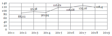 Contextualizando el registro al departamento, el SIVIGILA, en el periodo 2012-2018, indica el aumento gradual en las tasas específicas por 100.000 niñas menores de 14 años con una leve disminución del año 2013 (95,38) al 2014 (90,94), que luego va en ascenso hasta el 2017 (129,16) para disminuir (118,4) en el último año de registro. Estas cifran expresan el alto índice de abuso sexual infantil hacia niñas y adolescentes, con la tendencia a ampliarse año tras año. La figura 2 refleja este comportamiento en el departamento:
